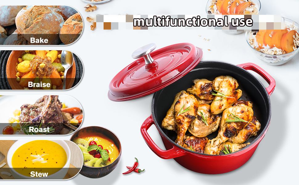 💥Enameled cast iron cookware provides even heat distribution and superior heat retention; colorful exterior enamel resists chipping and cracking