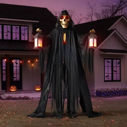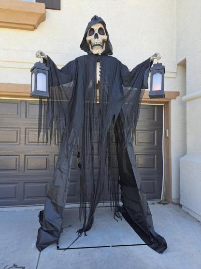 The Skeleton Arch is equipped with a motion-activated sensor that springs it to life when visitors approach. With lights and sounds that provide a little trick before the treats, this Halloween decoration is sure to give a good scare. The realistic sculpted details in the skull and hands, along with a dark hooded cloak, give this reaper an eerily authentic look.