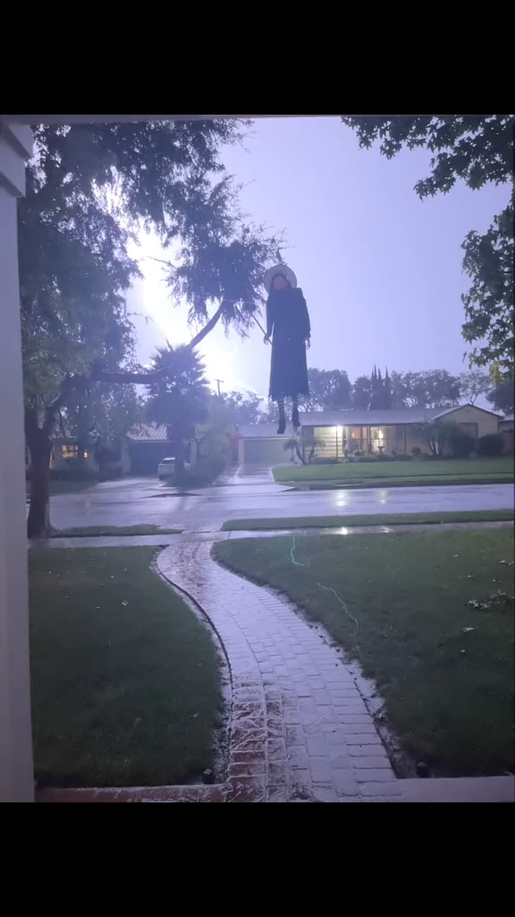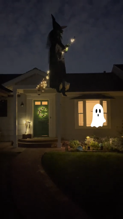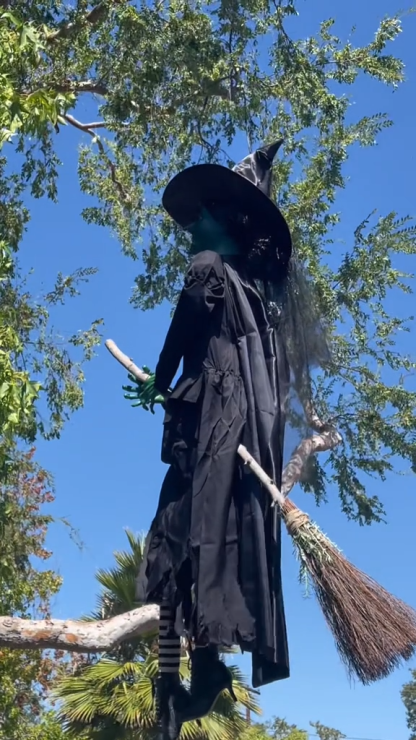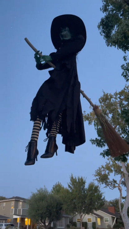 The 7 ft. Hovering Witch has animated LCD LifeEyes that move around and blink. LEDs light up her ghastly, floating figure. Hovering Witch has a moving head and mouth. She is motion sensor activated and speaks 5 different witchy phrases. The in-broom support metal makes it look like she's really levitating. This indoor and outdoor Hovering Witch is perfect for your Halloween display.