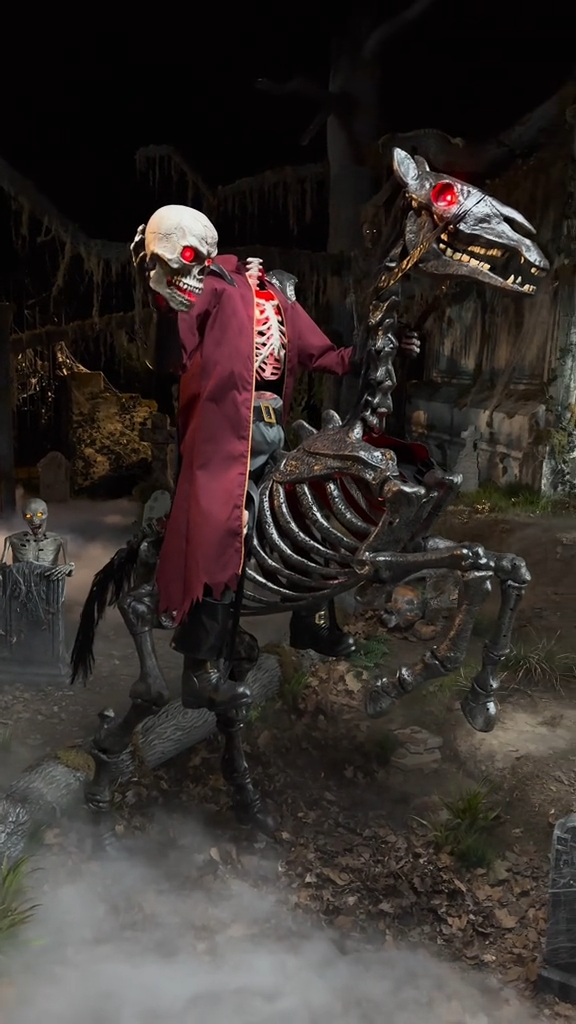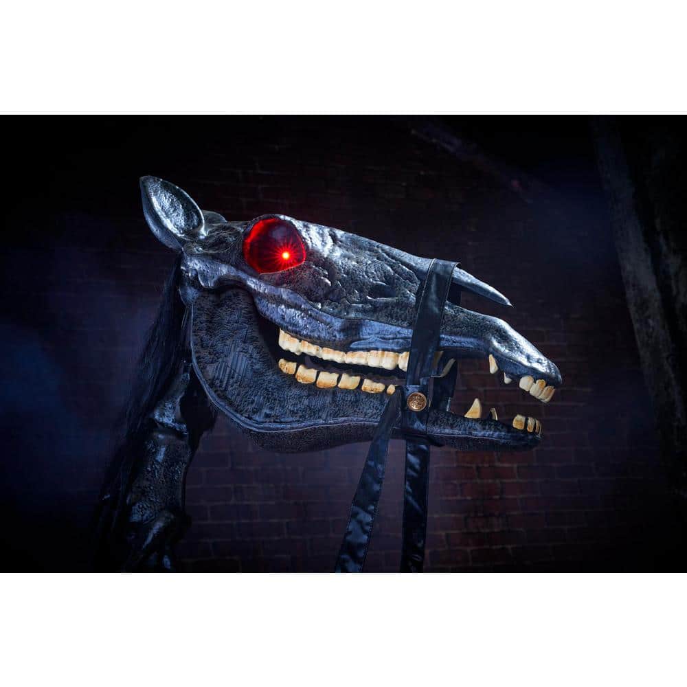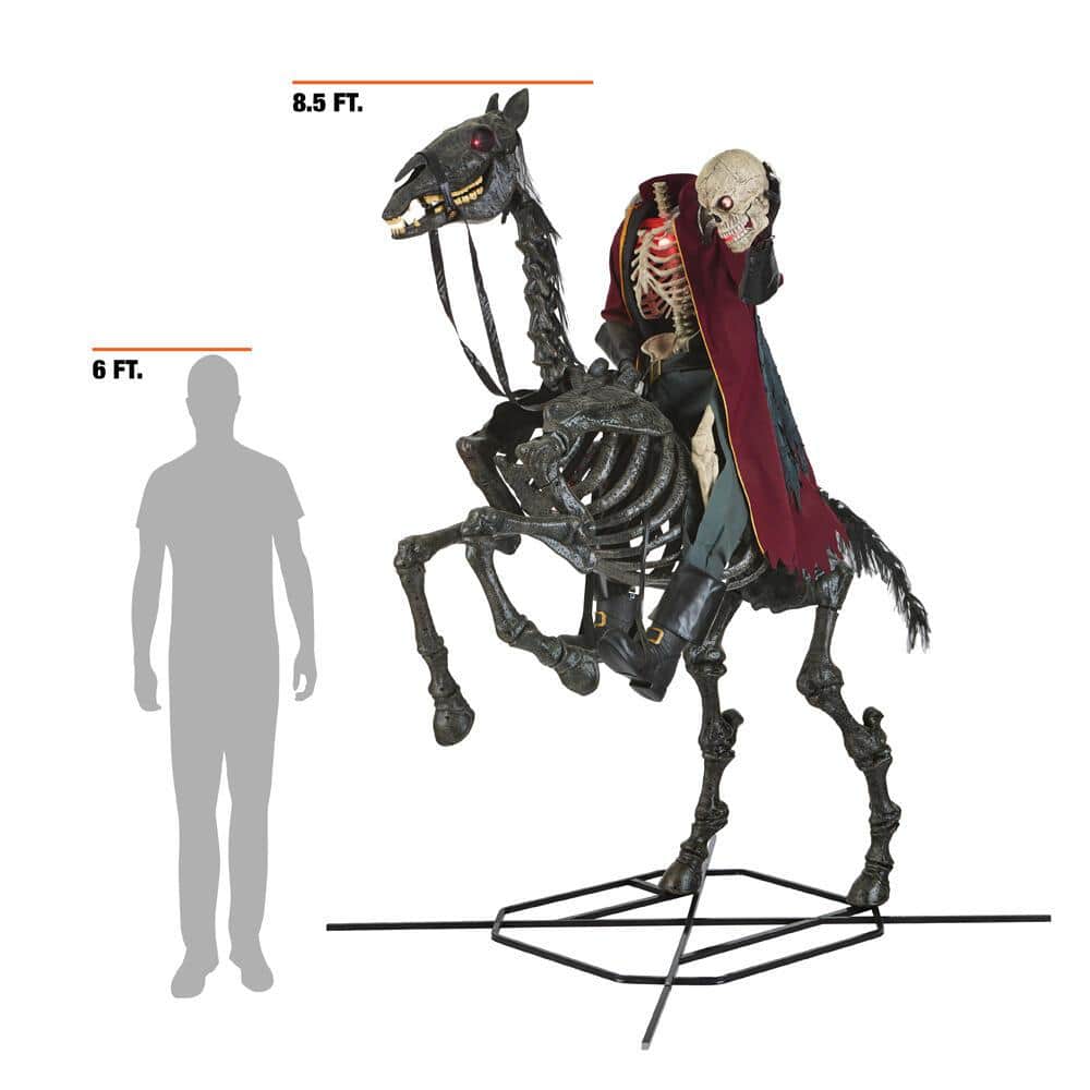 The 8.5 ft. Giant-Sized Animated LED Knight Dullahan from The Home Depot is ready to scare with its red piercing eyes and a skeletal steed. It has molded construction with a moving arm, moving jaw and a moving head. There is an integrated steel stand to keep trick or treaters questioning how it is staying up. Knight Dullaham has motion activation and speaks 6 different phrases.