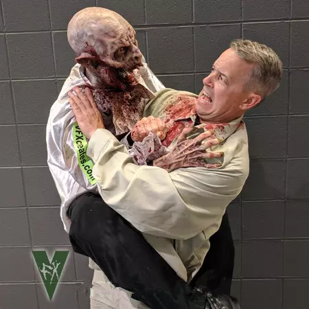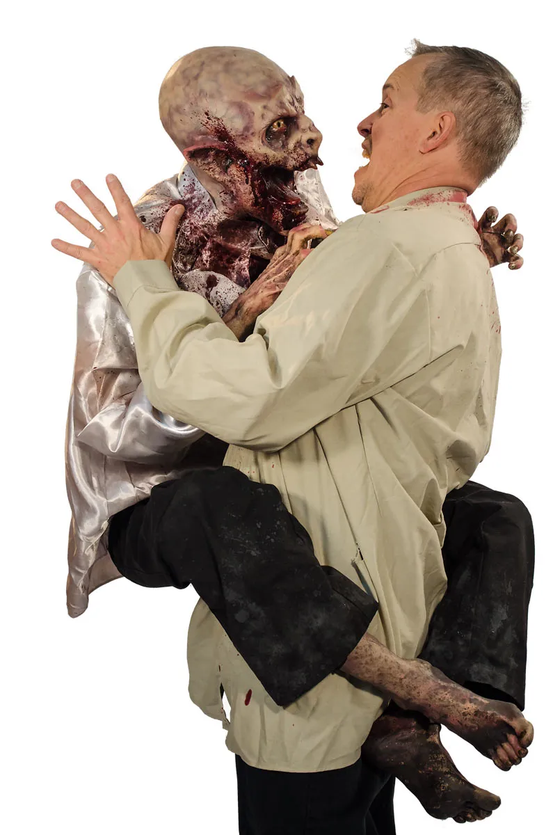 Ambrose The Immortal is our Attack Vampire Puppet that fits perfectly in a haunt attraction or wandering the streets entertaining and scaring up more business! This Attack Vampire puppet comes with all the amazing features as our Attack Line Puppets including a 2X Vampire Hunter shirt/harness that his hands attach to for that just grabbed you look.