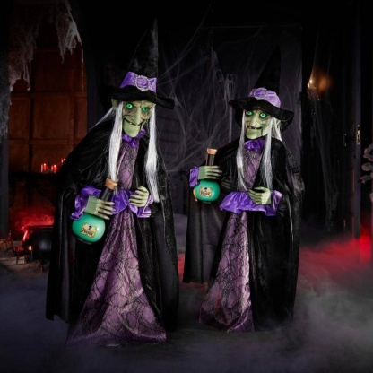 Get your Halloween grooving with these 3 ft. Animated LED Potion Witches. This set of two witches does a little dancing while wearing pointy hats and carrying green corked potion bottles. When the sound sensor is activated, the witches say spells and dance to a funky disco beat.