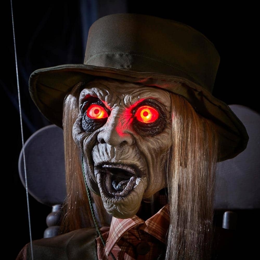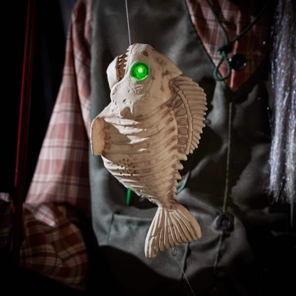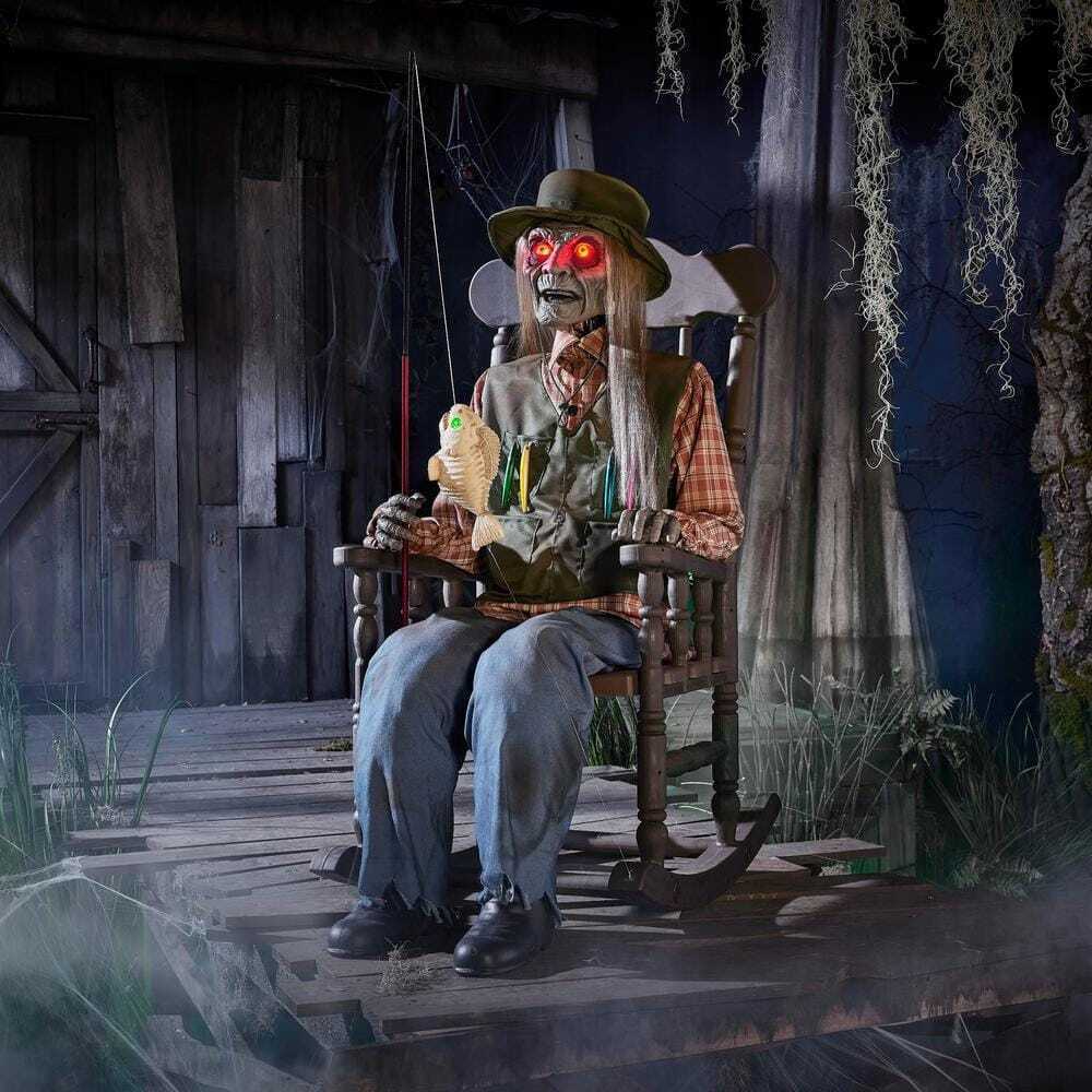 Create a spine-chilling Halloween scene with this 6.5 ft. Animated LED Rocking Chair Swamp Fisherman. The rocking chair starts moving when the infrared sensor detects movement to startle guests as they approach your porch. The fisherman's eyes light up with red LED lights and the skeleton piranha's eyes are green LED lights. The volume adjusts so you can customize to your noise preference.