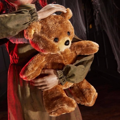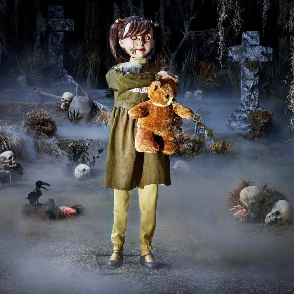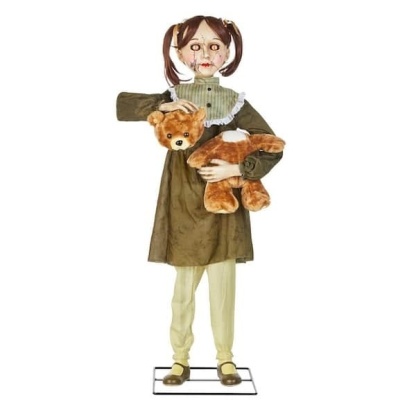 Add some frightful delight to your Halloween decorations with this 4.5 ft. Animated Little Girl. Girl is a child-size possessed doll who rips the head from her teddy bear. For an extra spook factor, Girl's eyes glow red and haunting sounds play from the speakers. Girl can be displayed indoors or outdoors, so this is a great choice for your porch, Halloween party or haunted house.