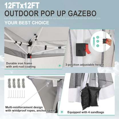 【Easy Set Up & Portable�?/strong>Install or close is efficient and hassle-free with COBIZI 11x11 pop up gazebo. Take out the frame, after unfold the frame and cover the two tops, just install the netting sidewall fixing with Velcro. Adjust the height and use the ground nails and windproof ropes to fix the patio gazebo. (Not for lightning storm, rainstorm or snowing days using)