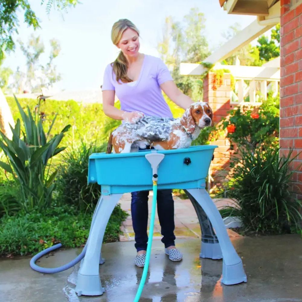 Pet bathtub raises and holds your pet, with 360-degree access for easy bathing and drying. Adjustable 3-point restraint system with removable quick-release collar.