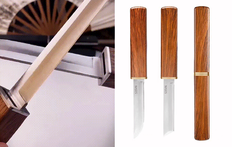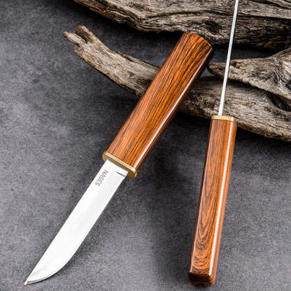DUAL KNIFE DESIGN: This set includes two high-performance knives with different styles, allowing you to handle various tasks simultaneously. They are cleverly housed in a single wooden sheath, ensuring convenience and safety.