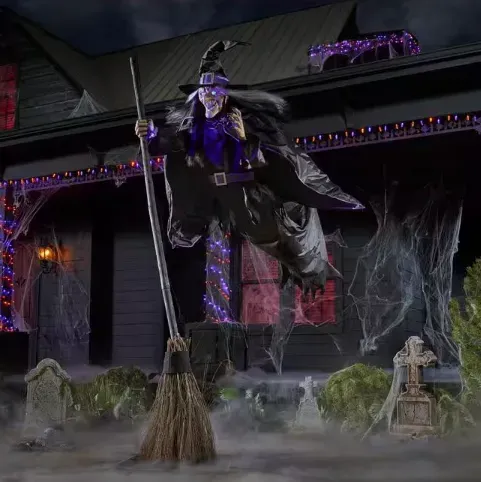 Designed for outdoor use, this 12-foot flying witch animatronic is the perfect centerpiece for any Halloween party.