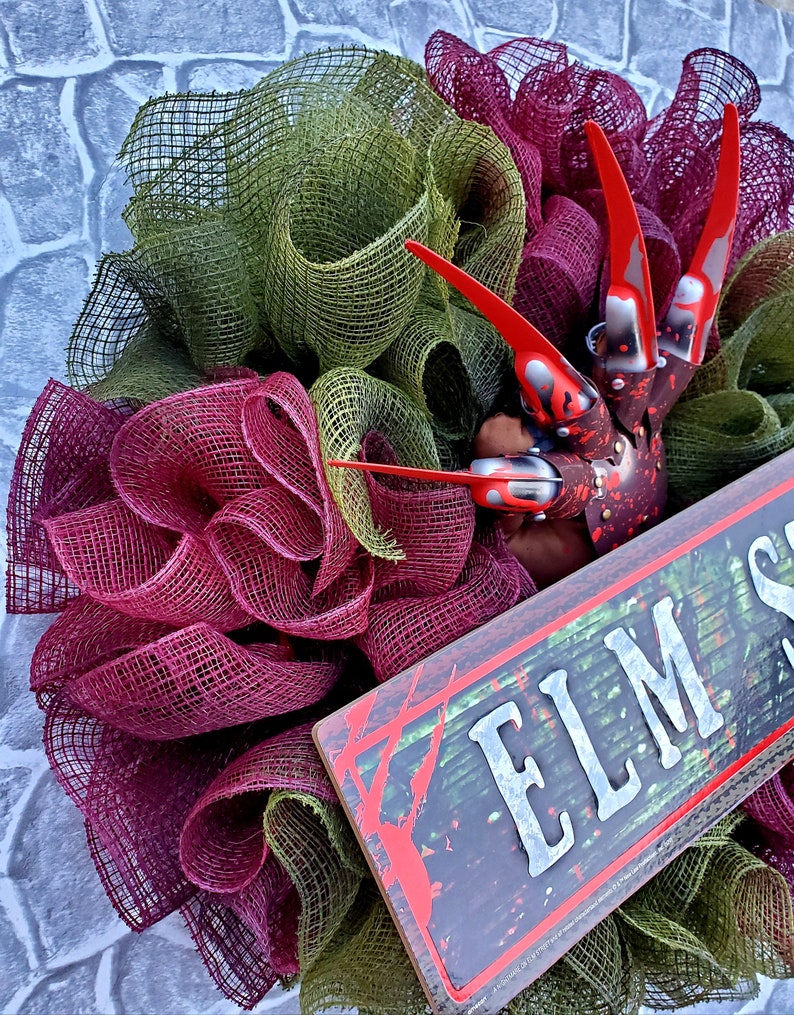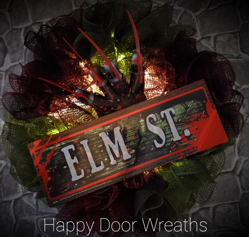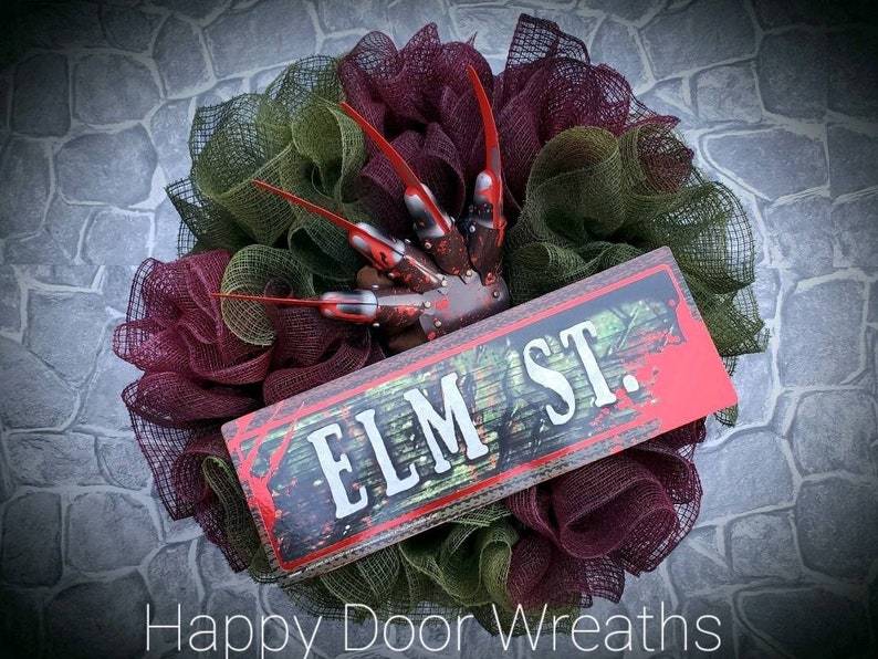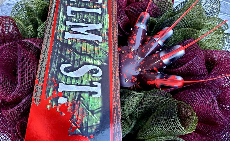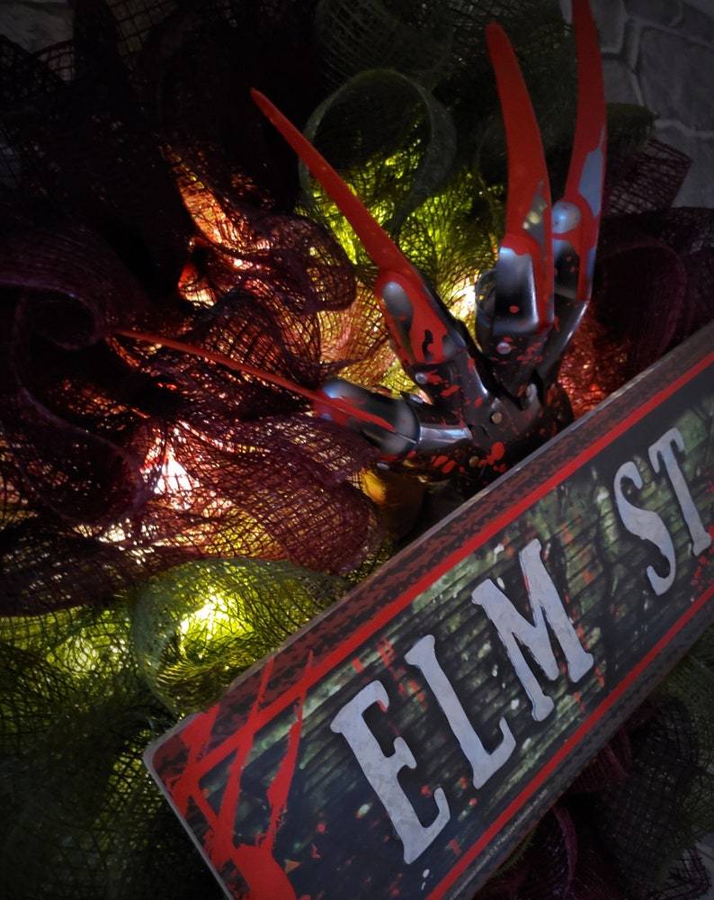 I made this wreath from fabric mesh that was distressed to give it that smokey fire look. It features Freddy's signature glove, dripping with "blood". It's finished off with an Elm St. sign and LED lights. Batteries included!