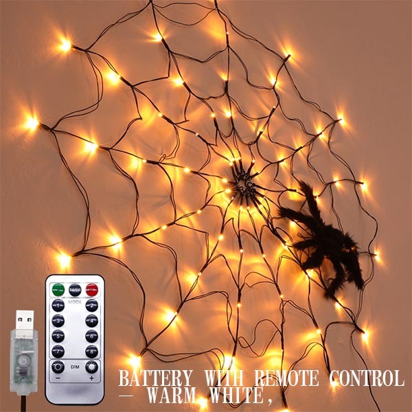 Specification Name: Spider web light (deliver a spider) Power supply: 5V USB Color: Warm white light,Purple light, Orange light Lighting method: Eight brightness modes adjustable Use scene: Halloween decoration Size information: 3.2Ft(with 70 e Led lights) Specifications: 1 meter in diameter Package Content :Spider web light*1, Accessory spider*1, Remote control*1, Battery box/USB *1