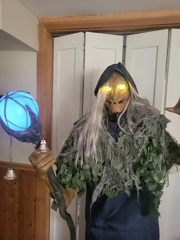 ANIMATED HALLOWEEN DECOR: 5.5-ft H x 3.3-ft W x 2.6-ft D indoor animated witch with sound and LED light effects in tattered seaweed clothing with lighted staff