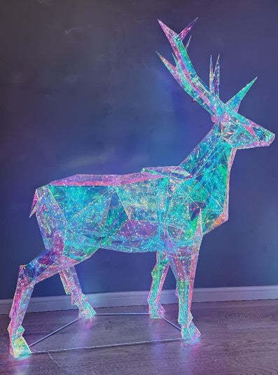 Transform your holiday display with our Iridescent Christmas Deer crafted by Dunn Deals. Standing at 57 inches tall and adorned with 610 LED lights, this majestic deer casts a mesmerizing glow whether placed indoors or outdoors. Add a touch of enchantment to your festive decor with this stunning centerpiece, meticulously designed to captivate and delight throughout the holiday season.