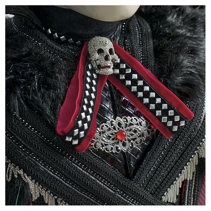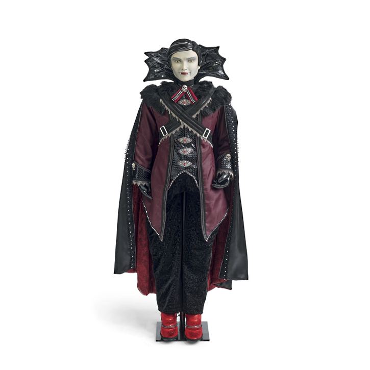 Dressed in bejeweled cape with faux fur detail and scalloped-edge collar that mimics bat wings; polyester fabrics