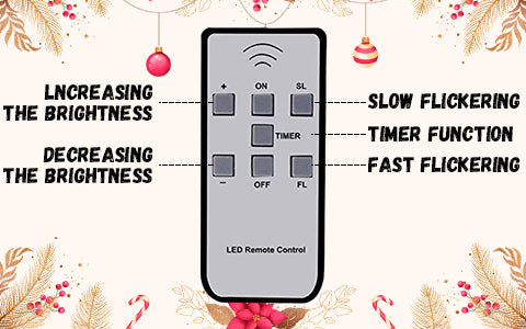 Main Features MULTIFUNCTIONAL LED CANDLES Each of the candles equipped with a clip. CLIP: Clip the candles on the Christmas Tree or Potted plant. Just put it in Candle chandeliers for decoration or use as floating candles hanging on the ceiling. CONVENIENT REMOTE CONTROL There are 7 keys on the remote control panel for user convenience. The timing function lets you control the candle lights from working 6 hours to automatic shutdown then restart after 18 hours." ON" and "OFF" buttons are intuitively separated so that you can switch the light on/off accurately. You can increase or decrease the brightness via "+" or "-" buttons and you can make these candle lights flash fast or slow via "FL" or "SL" buttons for a cozy ambiance. LONG-LASTING LED CANDLES Requires 1 x AAA Battery per Candle ( Not included), and has a long Battery life up to 350-400 hours (10 Days)Continuous Lighting, Avoid battery replacement frequently, and save your money. These window candles will give you a magic world! SAFE & ROMANTIC Flameless, smokeless, no fire hazards or burning risks, safe for families with pets or young children. Provides a clean, romantic, safe, and elegant solution without any mess or hazardous flames associated. WIDELY USED These flameless flickering LED taper candles can create a warm and romantic atmosphere and can be widely used to decorate Homes, Bars, hotels, Harry Potter Parties, Birthday, Holidays, Wedding, or other occasions. Using Methods Specifications