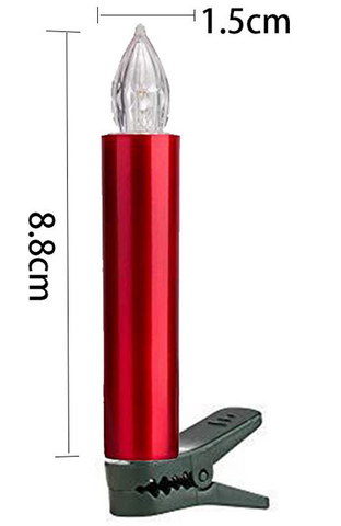 Product Weight Net Weight: 213G Packing Weight: 220G Product Size (L x W x H) 1.5 × 8.8 cm / 0.59 × 3.52inches Package Contents LED Christmas Tree Candles(white/red)× 1 >>Candle light× 10 >>Clip ×10 >>Timing remote control × 1 >>English manual × 1 >>Colorful package× 1
