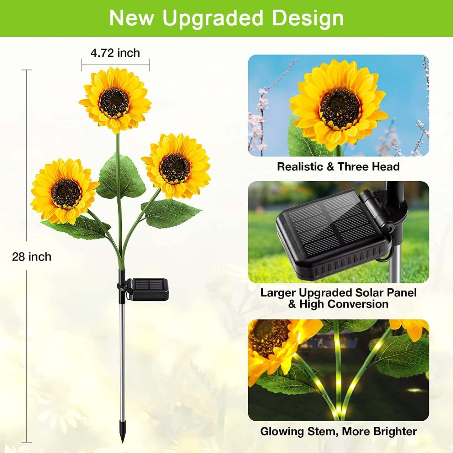 BEAUTIFUL & REALISTIC: Simply beautiful, especially at night! Made from new material and the flower's petals are exquisitely designed to mimic real flowers. Glow in the dark, these Solar sunflower lights make your garden unique!