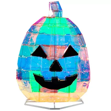Illuminate the night with this Light-Up Holographic Jack-o'-Lantern Pumpkin. Constructed with a mosaic of holographic tiles that encase LED string lights, this Halloween decoration enhances any space with its subtle glow.