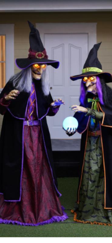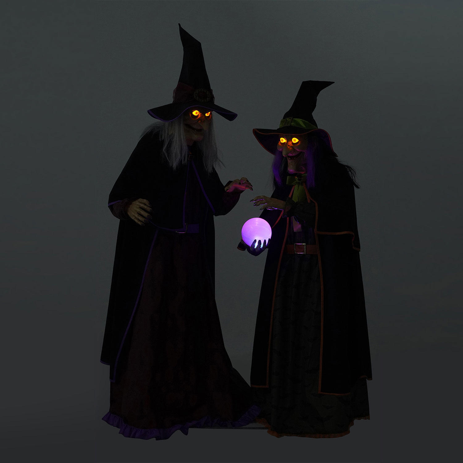 Introducing the Member's Mark™ Set of 2 Animated Crystal Ball Witches, a perfect addition to your Halloween decor. This spellbinding pair is sure to captivate friends, neighbors, and trick or treaters alike. With their piercing LED eyes, they light up the night, creating a frightful yet delightful spectacle. Dare to come closer and watch as these witches cast their spells, their mouths and arms moving in animation for a truly eerie experience.