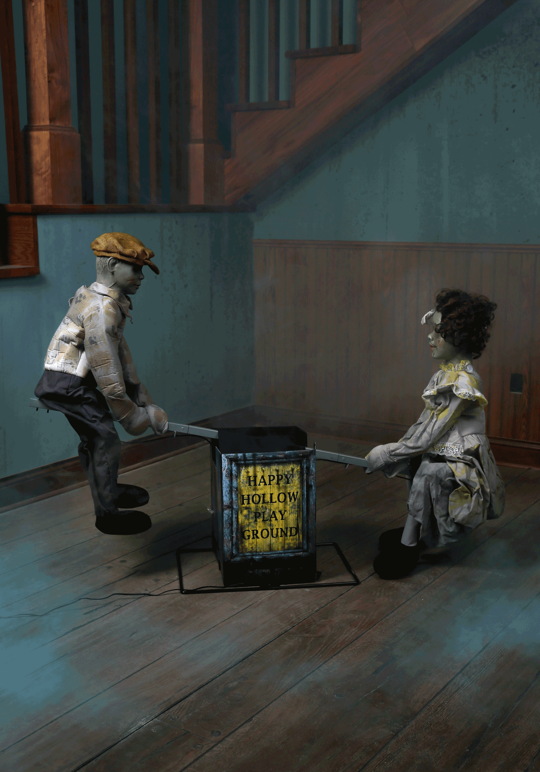 When activated, dolls' eyes glow, seesaw moves up & down and plays a haunting tune