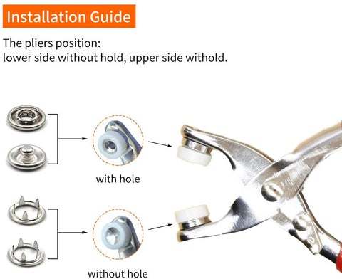 Put the hollow prong rings on the pliers lower side without-hole and the male and female snaps on the pilers' upper side with hole.