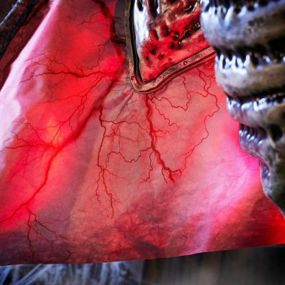 Glowing LEDs illuminate the eyes and wings with a red spooky glow