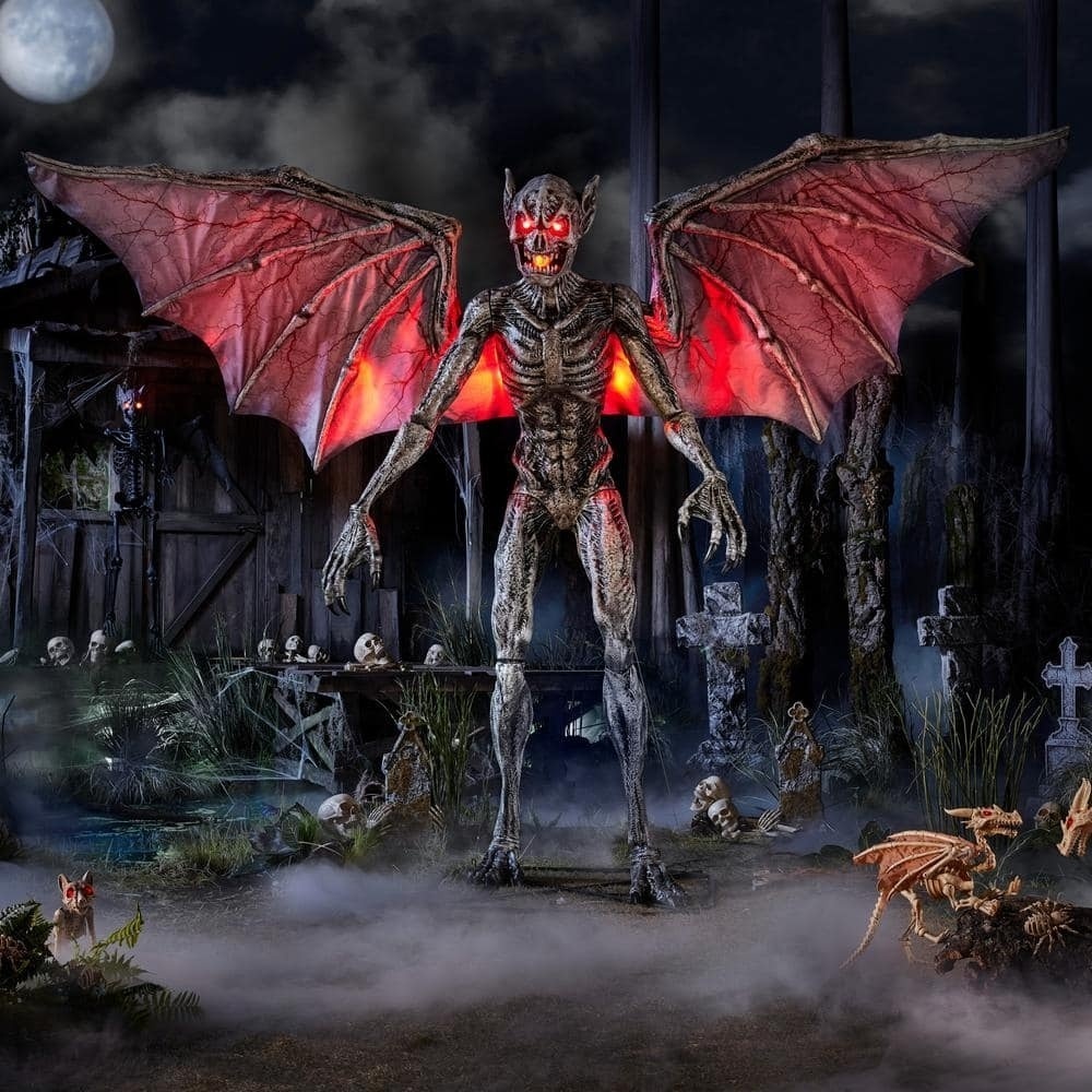This 9-ft. LED Wide Animated Bat Man of the night inflatable adds beastly fright to your Halloween scene. To terrify your guests, it comes with a motion sensor that triggers the mouth and head of the monster to move while eerily growling. Realistic wings with a red glow span 12.5-ft. wide and add more frightful delight. This creature will add an intimidating presence to your space.