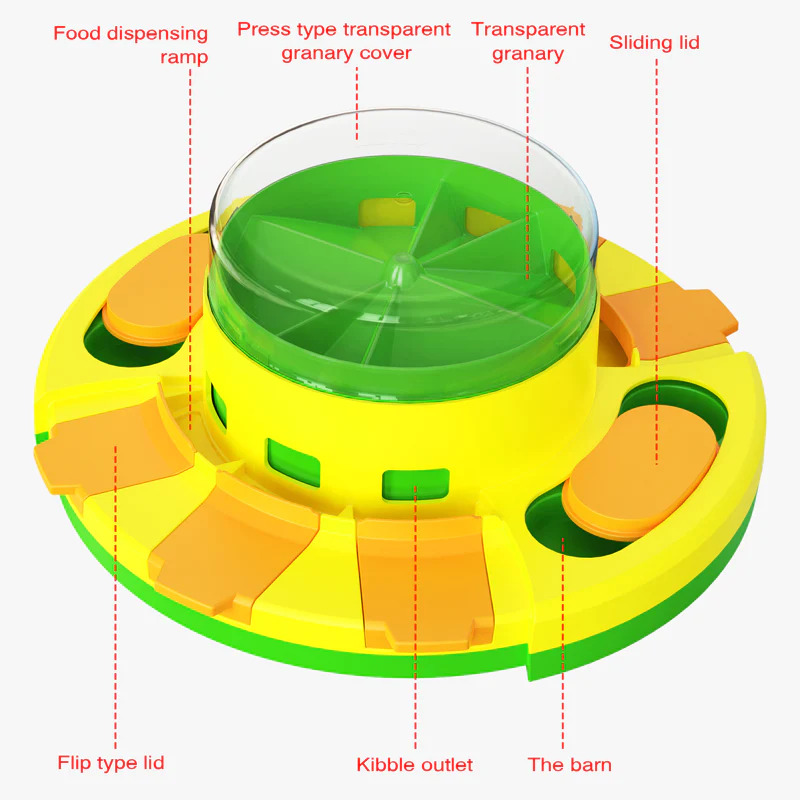 [The upgraded puzzle toy] It can be played with difficulty level 1 alone or played with difficulty level 1 and 2. Gameplay of level 1: add the dog kibbles into 8 barns around the toy, 6 flip type barns and 2 slide type barns. Guide the dog to flip or slide the lid of different barns on the food plate with his paw or nose, and he can get food reward by playing with the toy. Gameplay of level 2: the dog needs to press the transparent granary cover first, and kibbles will leak out of the granary into 6 barns around the granary, and the dog needs to flip the lid to get the food.